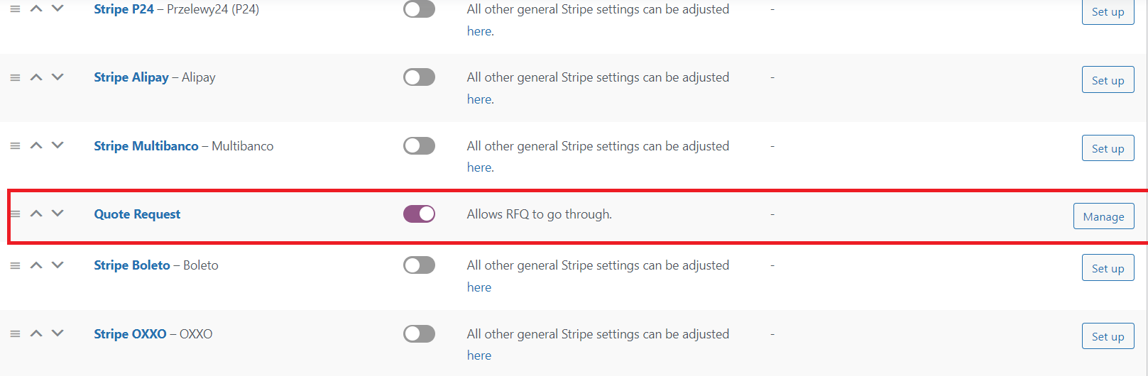 Navigate to WooCommerce->settings->payments and select Quote Request